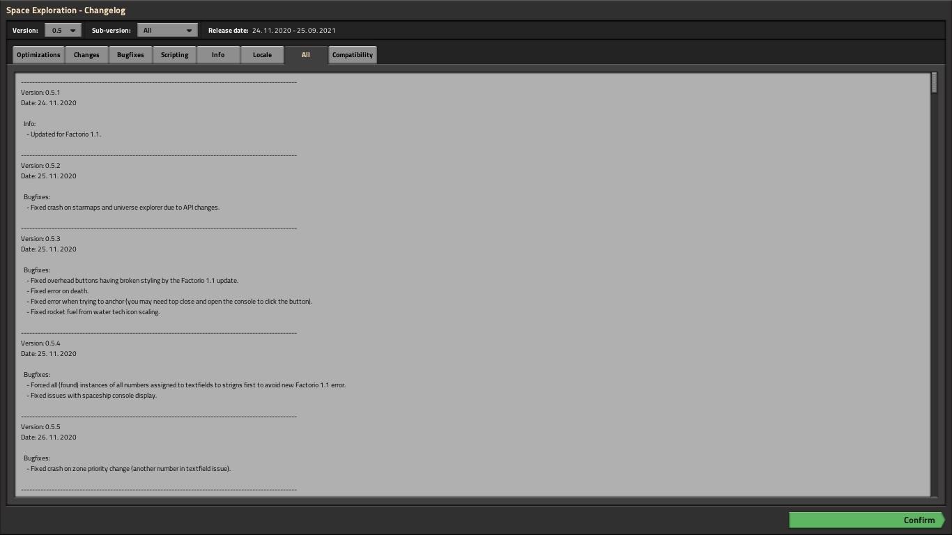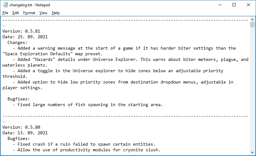 It is very unusual to have changelogs go from oldest to newest, so personally I'd prefer that the in-game changelog switches direction for both base game and mods.Klonan wrote: Sun Sep 26, 2021 12:23 pm In-game the changelog is always oldest to newest, even the base game changelog,