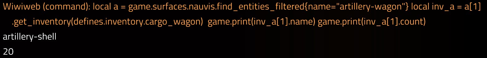 /c local a = game.surfaces.nauvis.find_entities_filtered{name="artillery-wagon"} local inv_a = a[1].get_inventory(defines.inventory.cargo_wagon) local inv_b = a[2].get_inventory(defines.inventory.cargo_wagon) inv_b[1].transfer_stack(inv_a[1]) - Only 1 shell was transferred to the second wagon, where I would expect the whole stack to be transferred.