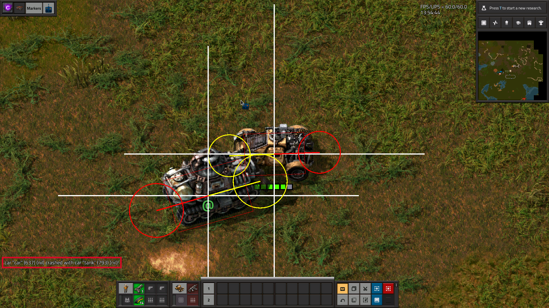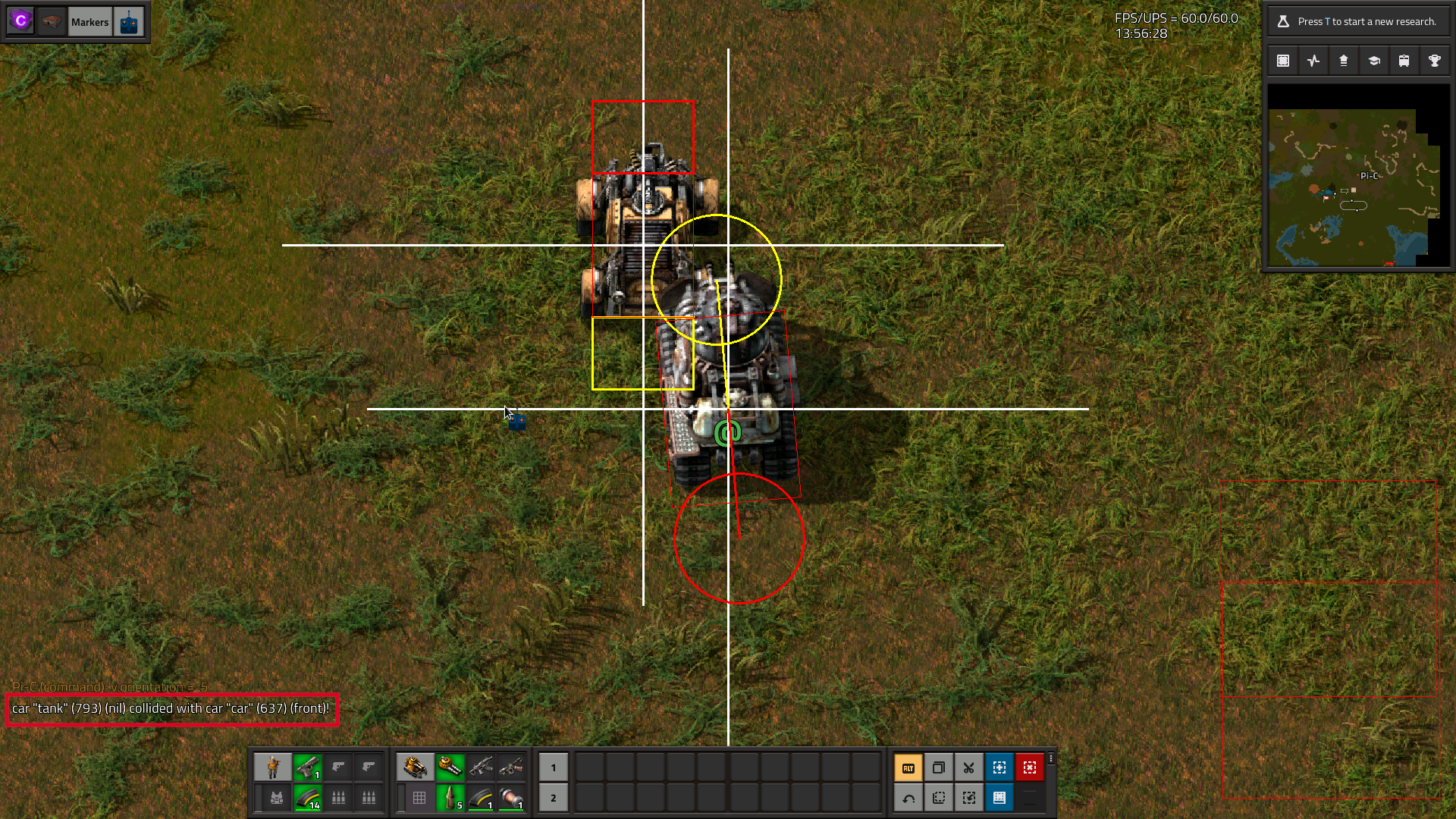 The following screenshots visualize the way searching for entities is done. The thin red lines are the collision boxes (activated via debug settings). The white lines are the x- and y-axes of the vehicles, with the vehicle center as position {0, 0}. Yellow drawings show the search area in front, red drawings (thick lines) the search area at the back of a vehicle. The text at the bottom left indicates where each vehicle found the other one ("front", "back", or "nil").