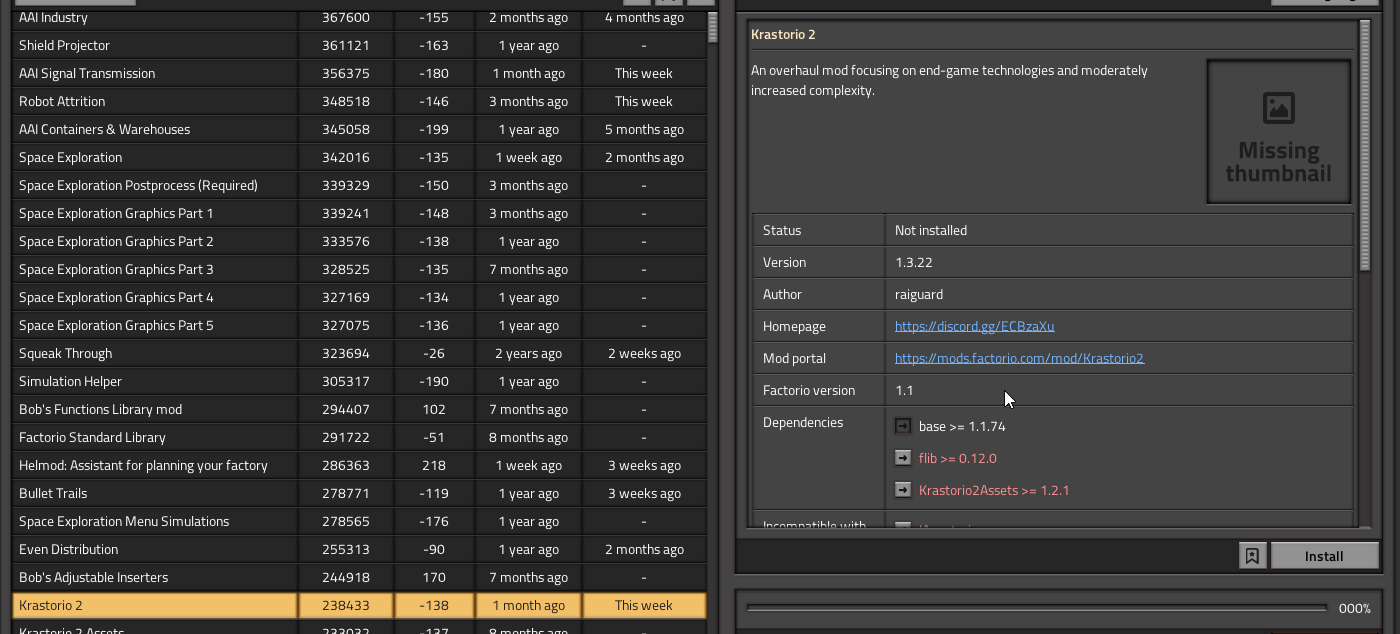 On the install tab, I select Krastorio 2 and scroll halfway down the page. If I now proceed to select Space Exploration it will be partially scrolled down with the exact same offset that I scrolled on the Krastorio page.