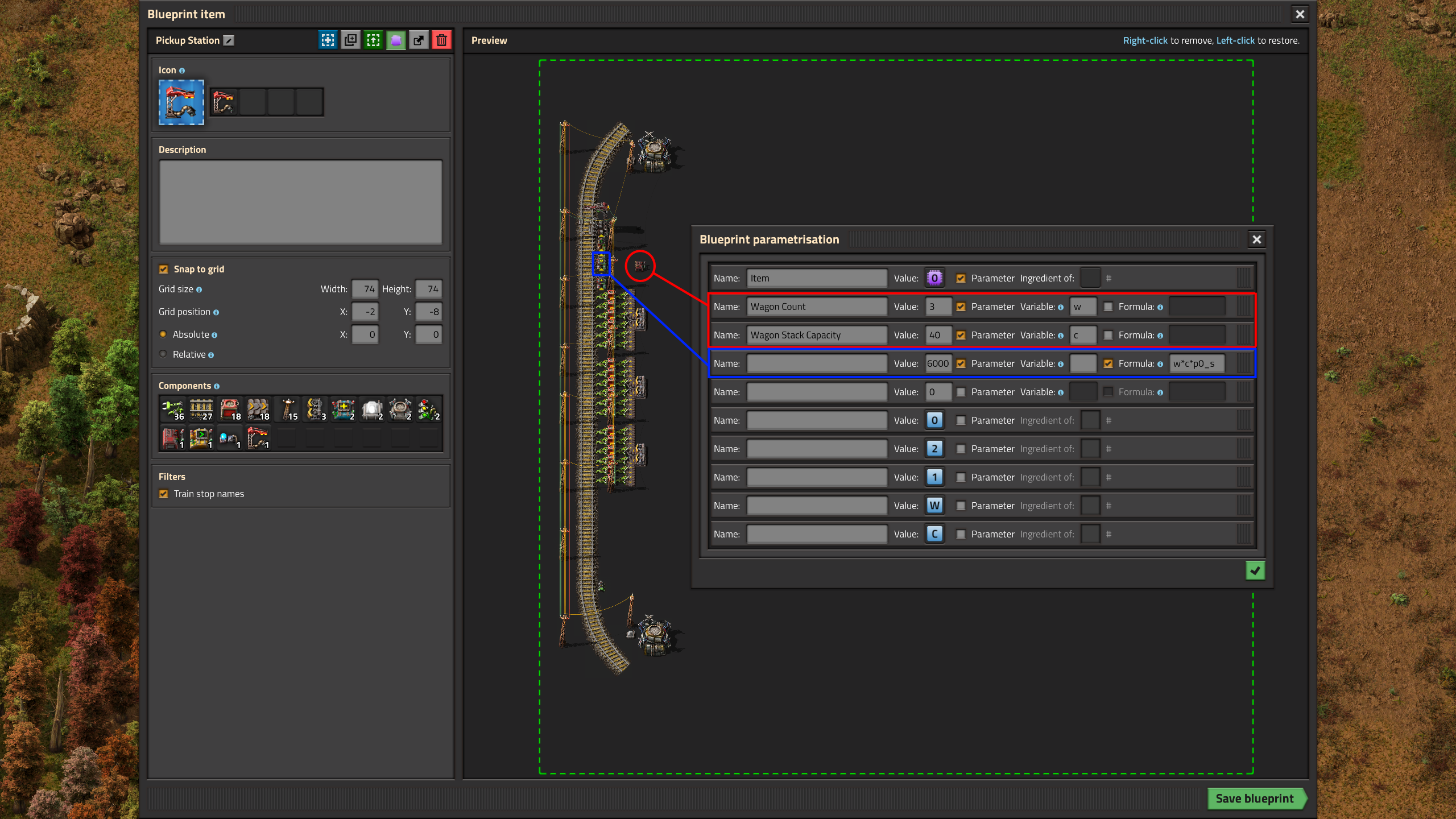 Just came here to add that I wanted to do exactly this but the UI doesn't allow you to just create variables. I want the user to be presented with a item and then a number for stack count, everything else would be calculated from there.LeftyRighty wrote: Thu Oct 31, 2024 10:00 pm just run into this, wanted to setup a "logistics drone fed assembler" bp with "number of stacks" to be stockpiled as an input to the bp placement (i.e. p0_s * stack_count as the enable/disable cutoff for the assembler) but since that isn't something concrete in the game i've had to add in a constant combinator just to have a signal "thing" to hold a value, and then the combinator has to be deleted after placing the bp