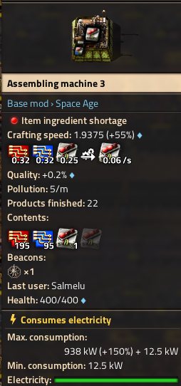 I somehow forgot to put 2+2 together. You are correct it's caused by the beacon and it's not a bug, it just confused me how the first module put added +0.2%, and second module worked normally, since the -3% from the beacon is not explicity stated. Thank you for clarifying.boskid wrote: Tue Oct 22, 2024 8:45 am I am going to shove this straight into Not a bug because you are not showing all the relevant details and the tooltip clearly shows that issue is on your end.