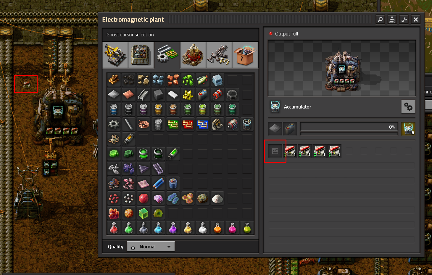- ctrl+click the accumulator crafting building (ctrl+f it on the map) to fill it up with Uncommon Quality module mk 3.