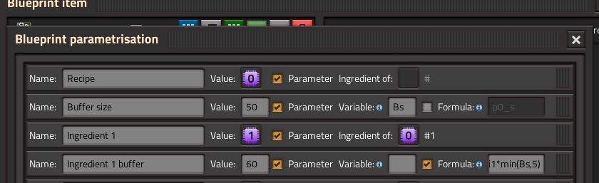 When creating a parameterised blueprint where the recipe and quantities of an assembly machine is set using parameters, any numeric parameter with the formula checkbox disabled but a non-empty formula field, will be treated like it was still enabled (therefore, not giving the user an option to select a value when placing the blueprint and (in this example) only showing the pick recipe screen):