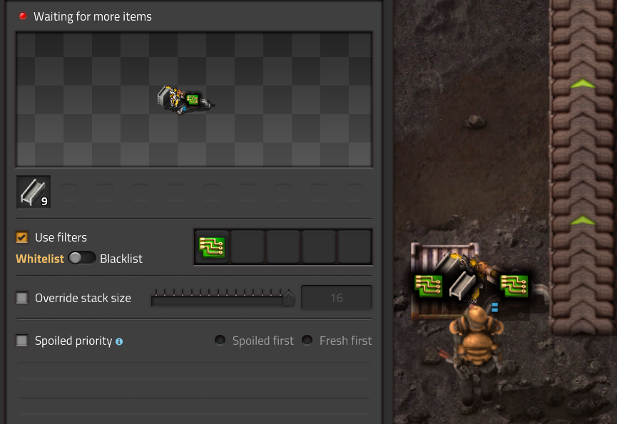 The inserter is stuck holding the non green circuit items in its hand with the status "Waiting for more items"