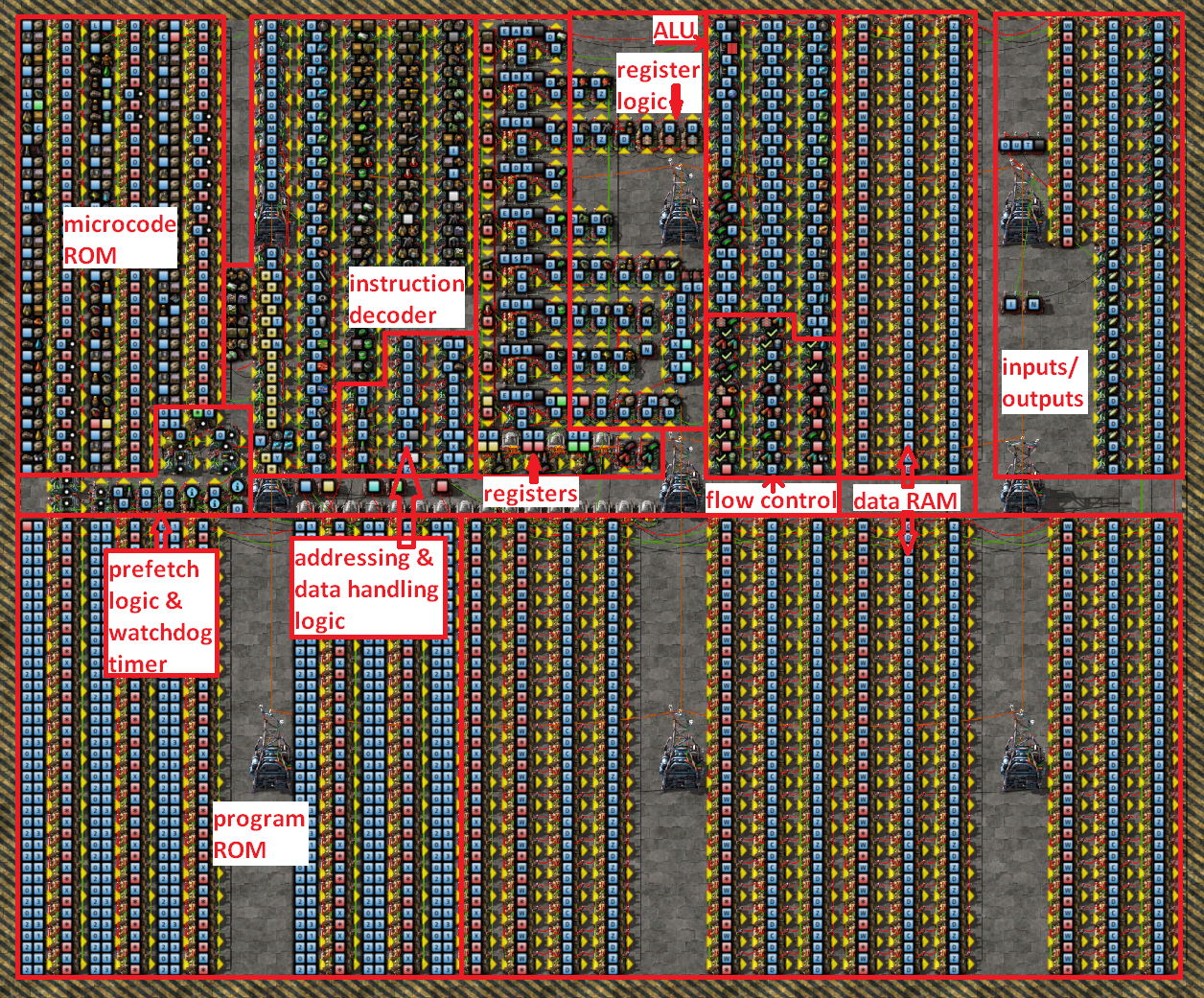 After all, my design goal was not to create an exact reproduction of the x86's capabilities, but rather to create an efficient and effective CPU; completely sufficient for the kind of tasks that could be reasonably expected of it in Factorio.