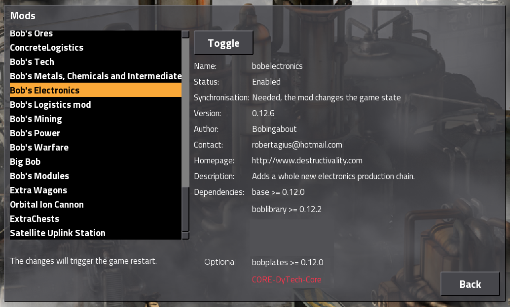 So this mod has two required dependencies without which the mod cannot run: the base game itself (a universal requirement, really) and the Bob's Library mod. It also has two optional mod dependencies, Bob's Plates and Dytech Core, but the mod can still work just fine without these mods installed.