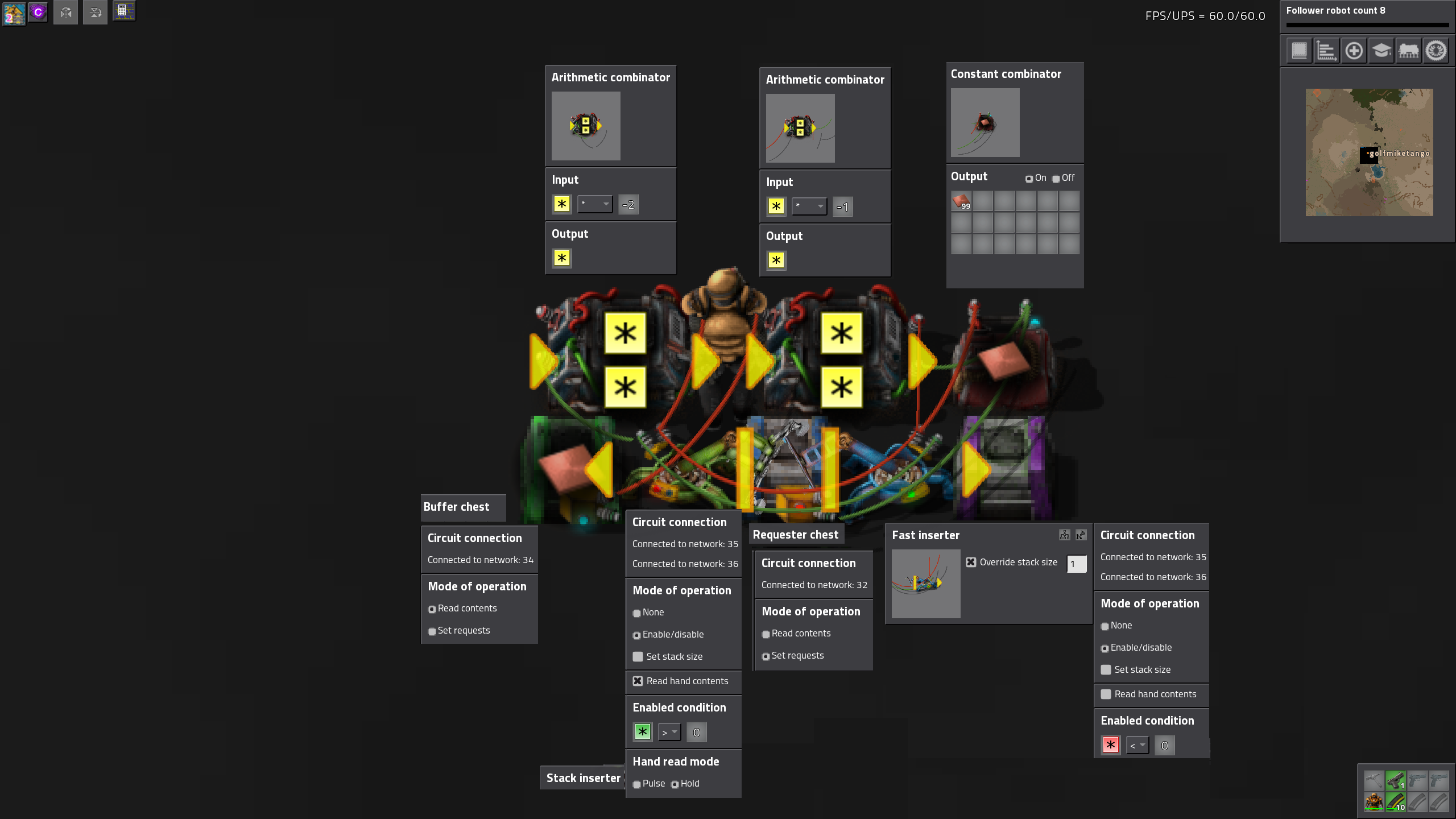 In the save you'll see I'm standing next to a terrible hack which builds green science from robot logistics. Note, in particular, the requestor feeding the iron-gear-wheel assembler just to my right. If you open up the UI for that requester chest, and hover the mouse over the request slot for iron plates, you'll see that