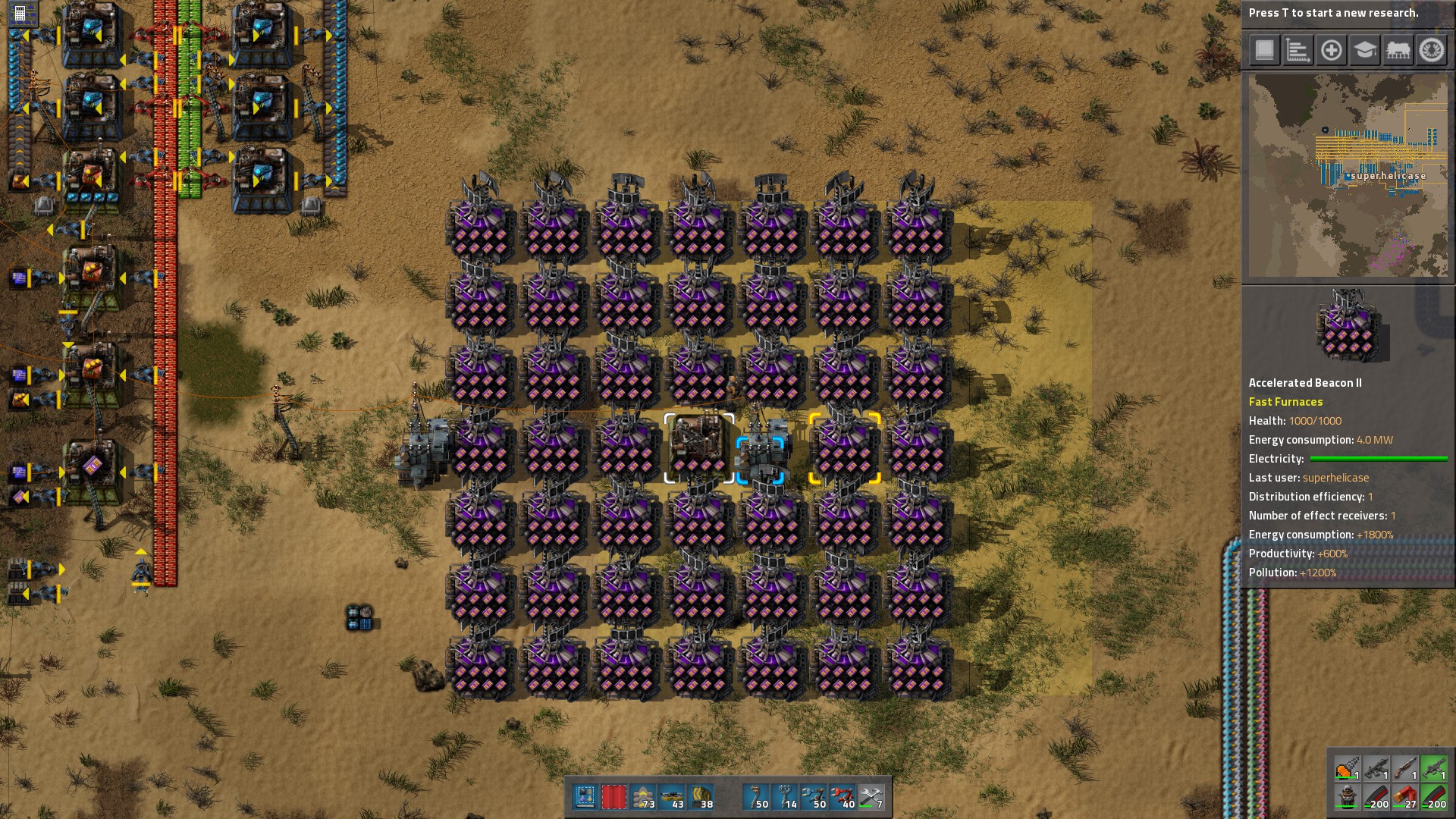 This issue isn't really a bug since it isn't possible with vanilla Factorio, but if you install some mods that give you more advanced modules and beacons, you can really crank up the bonuses on a single building. I'm still trying out different things, but I've found that if the electricity usage goes over 32760% (the actual limit I'm assuming is 32768, but I can't get any more granular than that with the items i have), the bonus suddenly goes negative. If yall are using C++ I'm guessing this is because the variable yall are using for the bonus is a signed short. Is there any chance that yall might increase the size of this variable, or with the number of entities that people place, would that make memory requirements for the game just that much larger? Is there anyway this thing might be altered using the api?