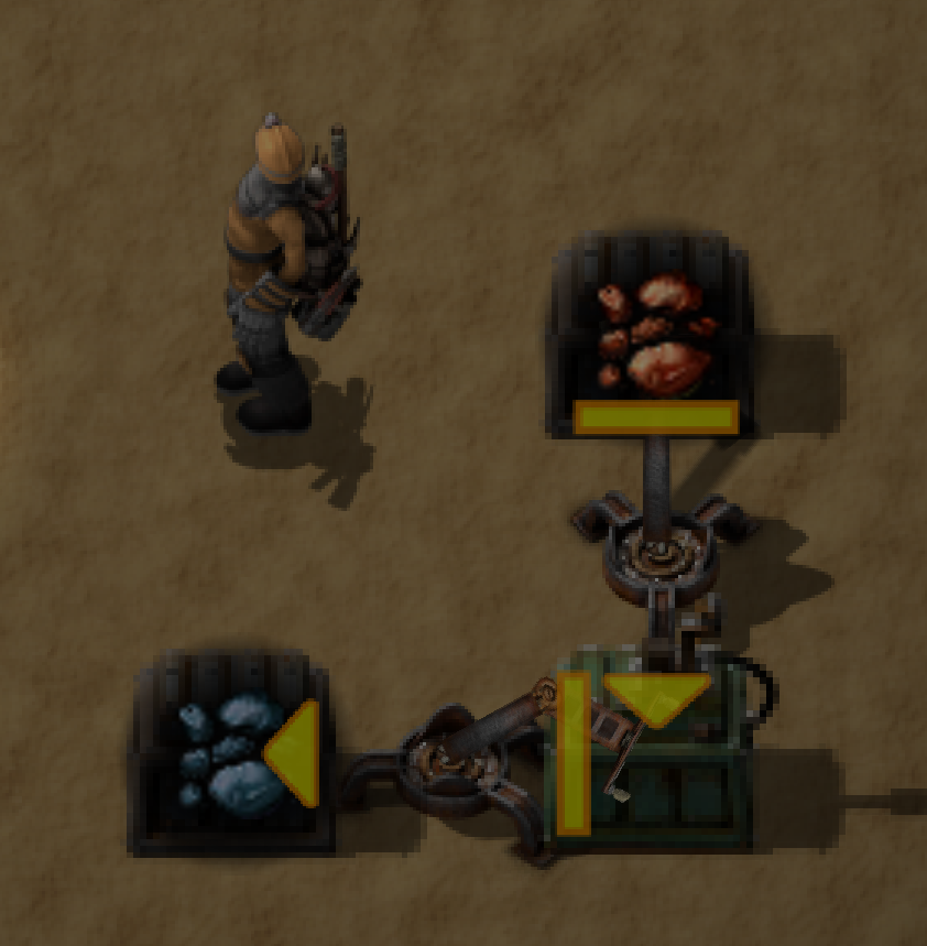 First we start with placing 2 inserters, with different kind of items... Afther that, we place our modded 'car' entity where the inserters are (NOTE: there is also a constant combinator on top of it without collision box, but with selection box, thats why you see the 'content' of that vehicle): When the first item gets inserted, I set the filter on the inventory slots to make sure only that 1 item type can be inserted. On the picture, this is why there is no copper getting inserted.