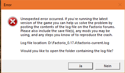 27.955 Error Util.cpp:97: Unexpected error occurred. If you're running the latest version of the game you can help us solve the problem by posting the contents of the log file on the Factorio forums.