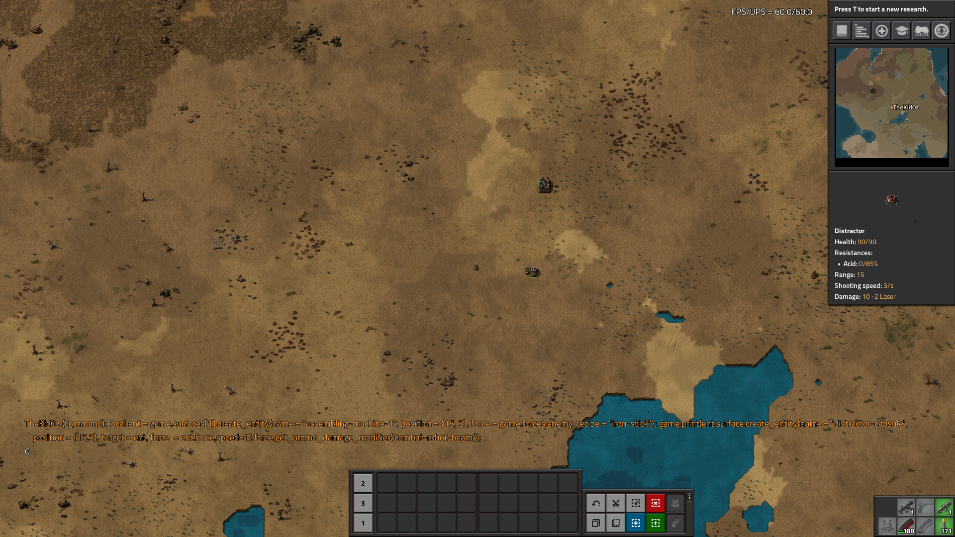 /c local ent = game.surfaces[1].create_entity{name = "assembling-machine-1", position = {15, 3}, force = game.forces.enemy, recipe = "iron-stick"}; game.print(ent.surface.create_entity{name = "distractor", position = {15,3}, target = ent, force = ent.force,speed=1}.force.get_ammo_damage_modifier('combat-robot-laser'));5. Affected modifiers - bullet, combat-robot-laser, combat-robot-beam