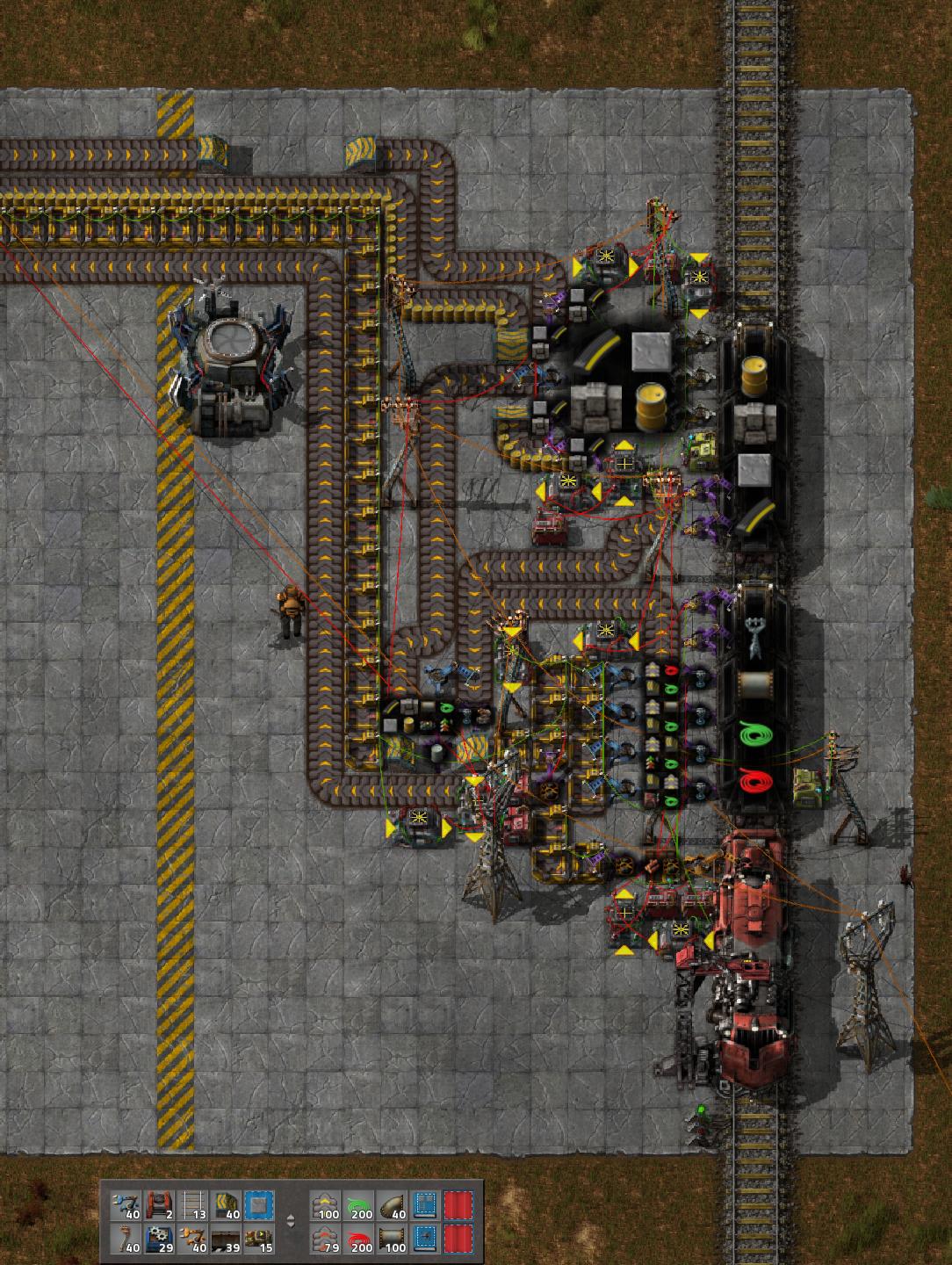 - Connect the train track and circuits to the big poles. Build at least the station and unloading circuitry.