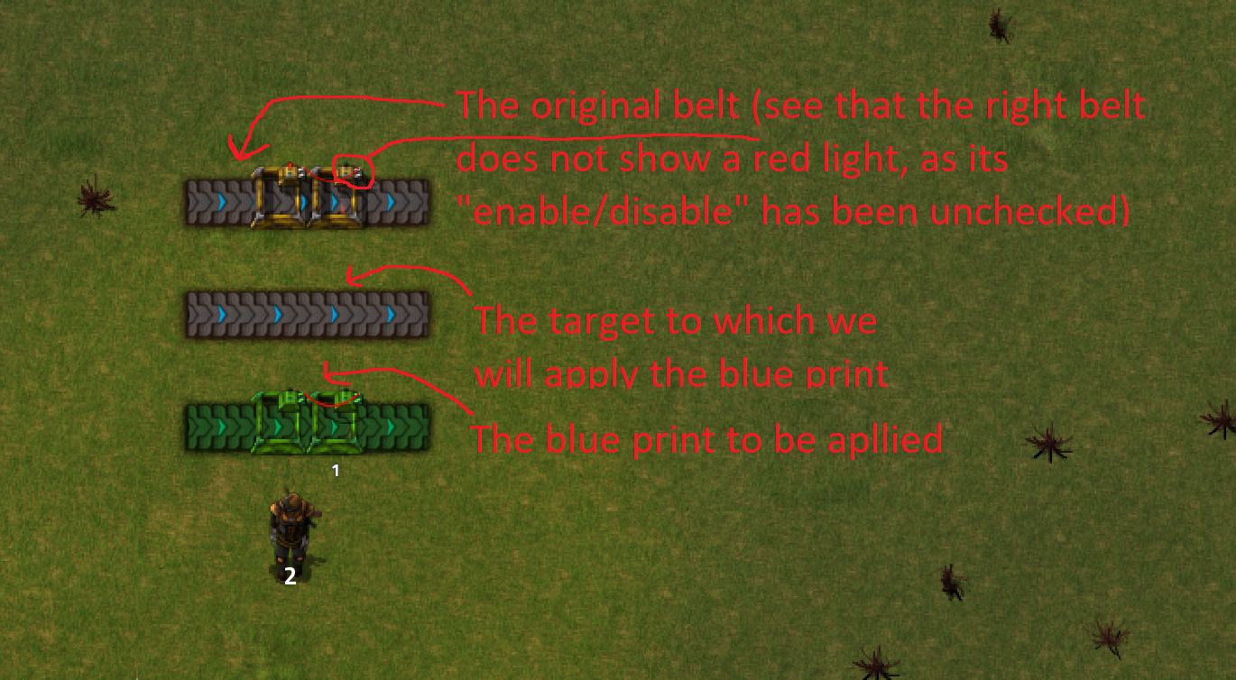 4) Paste the blue print onto an already existing belt (that is not yet connected to the circuit network)