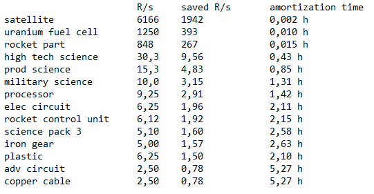 I recalculated some of this values for the new and changed recipes for Factorio 0.15.9. The calculations are for one assembler mk3 with 3 productivity modules mk3 and one speed module mk3 (except plastic which is 2 prod 1 speed). Since coal liquefaction gives 5 oil products per coal, i have assumed that 5 petroleum is worth 1 raw resources. For uranium fuel cells, i compared their energy value to coal. The amortization times are calculated including the initial costs for building the required power in form of solar. However, using nuclear energy should not change much, because the power cost was alwas the smaller part of the initial investment cost in my calculations. Keep in mind that these values are assuming that the machines are always running for that time. Anything not on this list gives even less returns, if i didnt forget something.