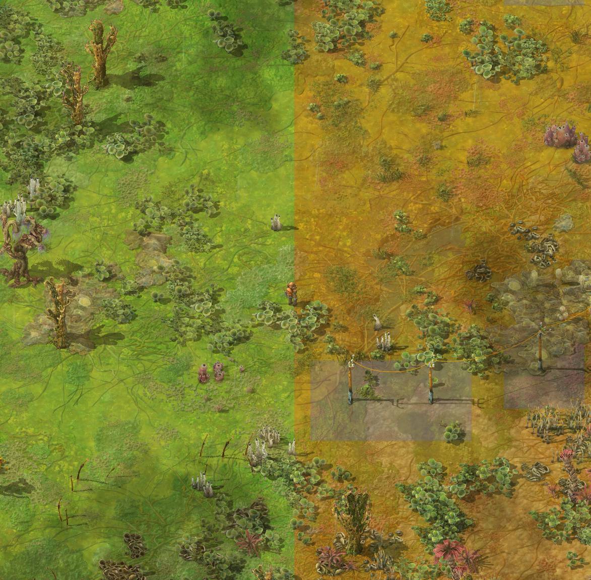 Not only is it way more obvious what the plantable soil is (tho I think more needs to be done for the tower (post a second reply about that). But its much more visually striking and lovely to me! Right now its SO DRAB,,, which for a lichen/jungle planet is sad