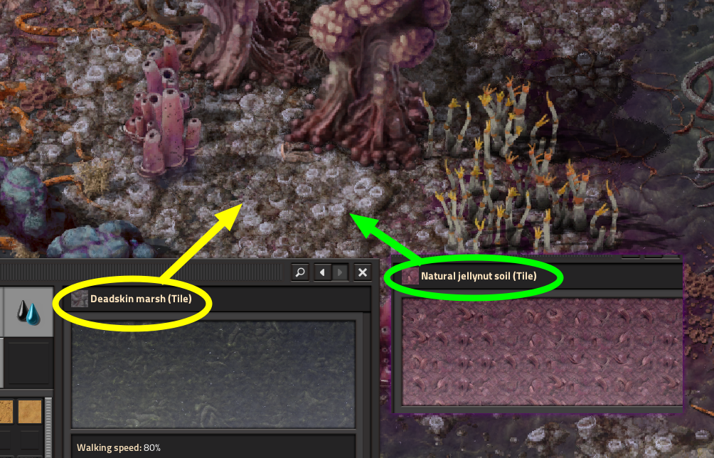 The map view and mini map are really helping a lot recognizing the actually important features of the world. Also, the ground tiles seem kind of inconsistent? When I alt+click on the ground, I get "natural jellynut soil", but I clicked on something that looks quite gray to me: