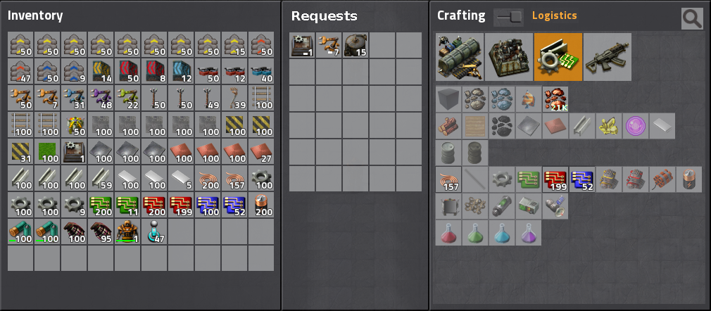 While trying to get the no-hand-crafting achievement, I open my inventory. While looking to the crafting panel on the right, I see all this dialog space wasted on item crafting and realize that I will never use for the remainder of this game. If only I could toggle a switch and instead of crafting, it would request the item from the logistics network? Once the logistics network is set-up, I might even stop hand crafting in regular games. I want to build 10 new Chemical plants? Click, click and they are immediately shipped and ready to build. As a bonus, I get all this free inventory space that I don't need for all those crafting ingredients, which I used to carry around. After building the chemical plants, because it was a one-time request, I don't need to wait for another 10 that are being shipped to me, just so I can send them back again.