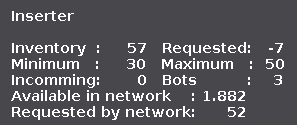 The "Requests" panel in the above picture shows that I have requested the logistics network to come pick up 1 Assembling machine and 7 inserters, while also bringing 15 Storage tanks. A logistics robot carrying 3 storage tanks is on its way to me. When it reaches me it drops all the storage tanks into my inventory, upon which the requested number goes down by 3 and will now display 12. If I had requested only 1 storage tank, then the robot would have dropped off only 1 and have carried the remaining 2 off to a nearby storage chest. In our case however, the logistics robot is no longer carrying anything and therefore immediately picks up the assembling machine. It removes the 1 assembling machine from my inventory in the left panel and simultaneously increments the number in the requests panel by 1. As the number of requested assembling machines is now 0, it is removed from the requests list. After the logistics robots have performed all my requests, the requests list is empty. Furthermore I will have exactly 50 inserters, 15 storage tanks and no assembling machines in my inventory. Note: another option would be to change this panel into a logistics request queue, similar to the hand-crafting queue. The benefit/drawback is that character logistics activity is immediately visible in the HUD.