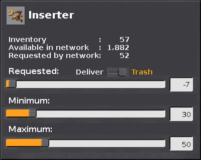 So, I want to keep 30 inserters in my inventory, but never more than 50. I switch the right panel to "logistics" mode, go to the transportation tab and shift-/right-click on the inserter. A dialog will pop-up telling me how many inserters I have in my inventory, how many there are in the logistics network. It also contains 2 sliders for configuring the minimum and maximum bounds for the amount of inserters that I want to have in my inventory. There is also a slider with which I can set the amount of inserters that are currently requested. For the picture above it will point to -7. Those sliders are longer than the tiny slider in the original logistics/auto trash panel and therefore are easier to use. For the number of requested items, there is a switch to toggle between positive (deliver) and negative (trash) values. Periodically, the requested amount is updated & clamped, such that minimum <= inventory + requested <= maximum. Where did the trash slots go?