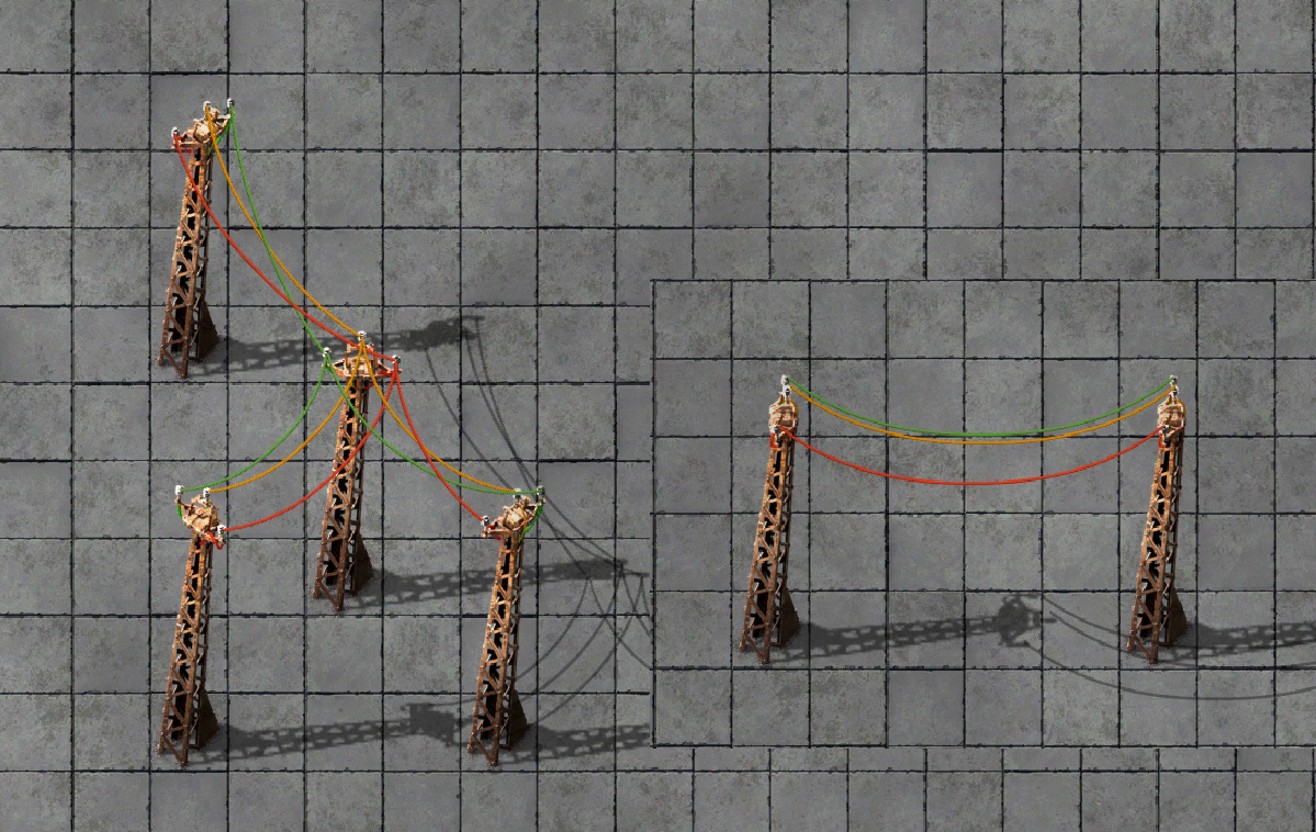 This really is an unnecessary inconsistency. Changing the wire positions for the substations to make them consistent with the other power poles will considerably reduce wire crossing – without any obvious downsides.