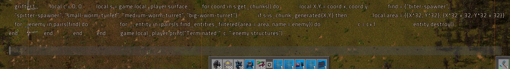 local c = 0, 0 local s = game.local_player.surface for coord in s.get_chunks() do local X,Y = coord.x, coord.y find = {"biter-spawner", "spitter-spawner", "small-worm-turret", "medium-worm-turret", "big-worm-turret"} if s.is_chunk_generated{X,Y} then local area = {{X*32, Y*32}, {X*32 + 32, Y*32 + 32}} for _,enemy in pairs(find) do for _, entity in ipairs(s.find_entities_filtered{area = area, name = enemy}) do c = c+1 entity.destroy() end end end end game.local_player.print("Terminated "..c.." enemy structures")