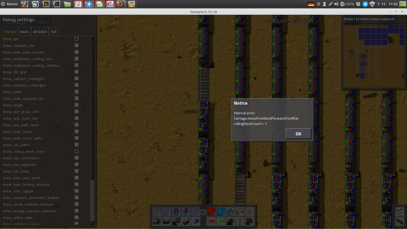 - when I try to move the train (no matter if forward/backwards or automatically), I get the error "Carriage::moveFrontJointForward frontRail rollingStockCount!=1"