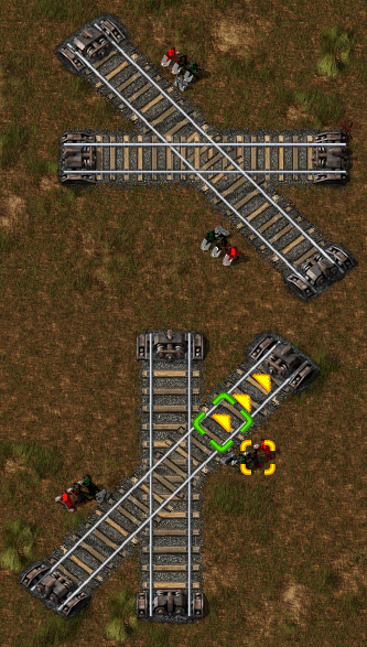 straight rail doens't collide with curved so there is every pieces of straight rail possible in the diagonal, althought afaik only the last, overlapping one is involved. All rails were placed before any signals.