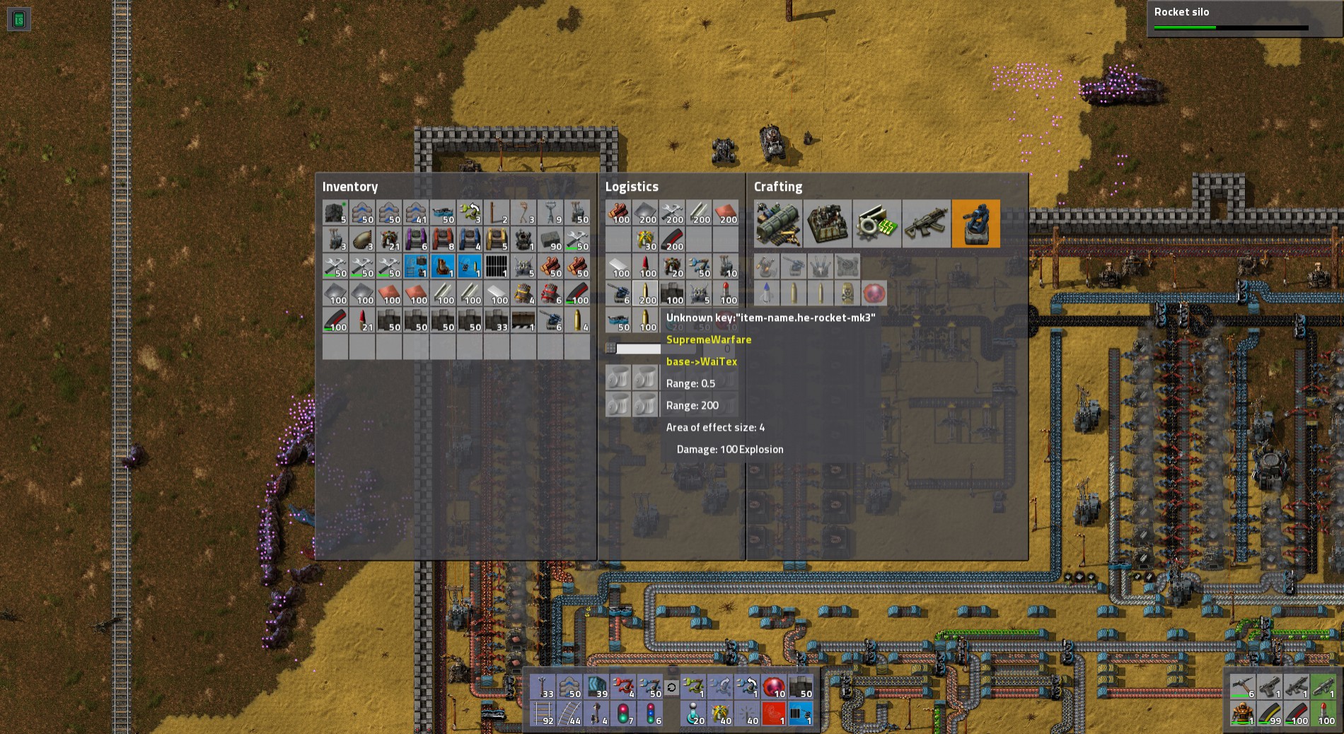 Hi, I've got an error using the RAPID FIRE ARTILLERY ammo: "Unknown Key:"item-name.he-rocket-mk3". It affects the smart loaders not recognizing the object. Anybody fixed this yet?