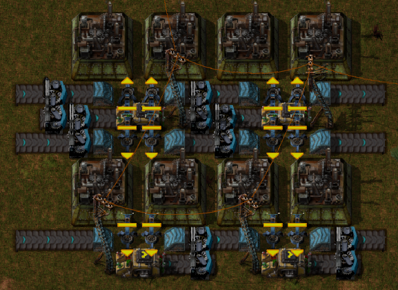• Over 5x speed: direct connection to assemblers (if allowed) with lots of speed boosts. Honestly I think it would be more fun and challenging if you were forced to move items into chests first, because getting the right layout of inserters adds complexity