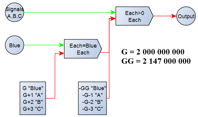 These values are added to the input signals that come in via red wire into an adder with setting Each+0:Each, and adder above that inverts (i.e. each*-1:each) the signals and the intervals.