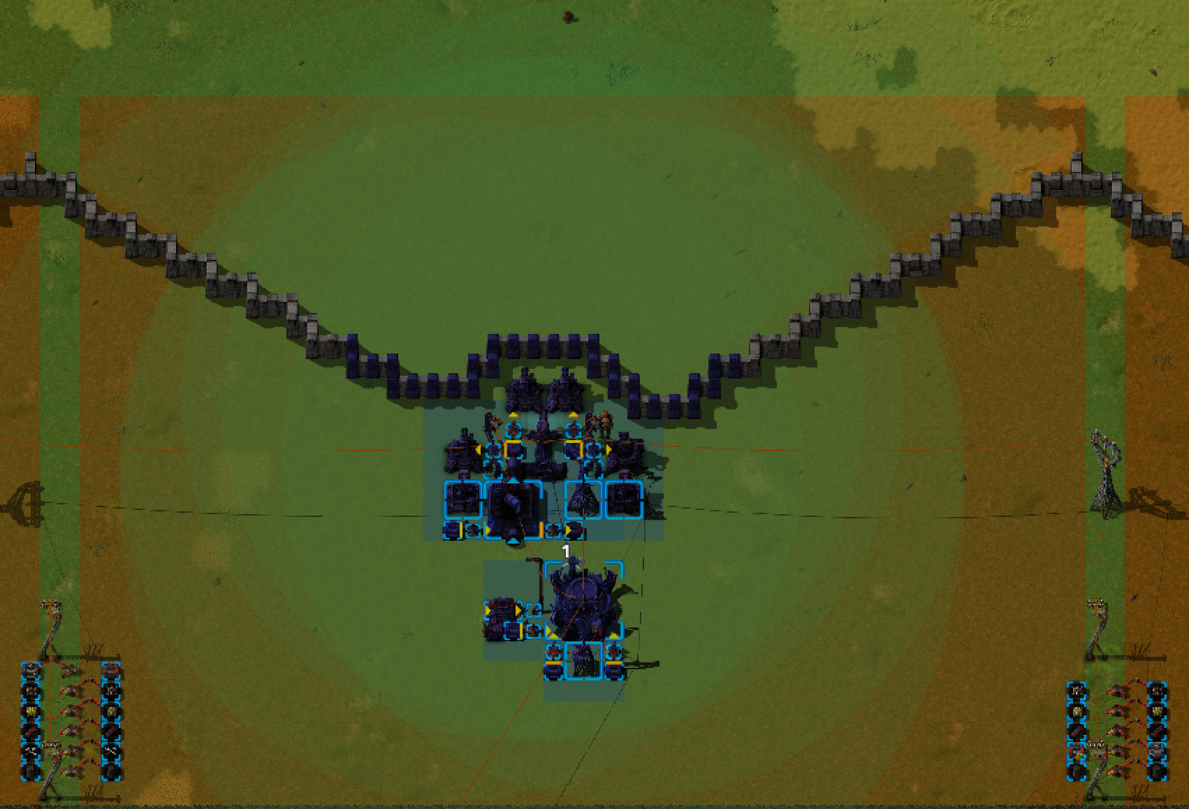 Thanks! I actually like the aesthetics of your wall a *lot* more than mine. However, it is nice having the turrets feed each other and minimizing the number or requester chests. I could actually have the entire mid-section between gates fed by a single requester in the middle, but it does take them a bit to fill when they are feeding each other like that (the ammo travels to the ends first, then buffers backward, like a belt would do).
