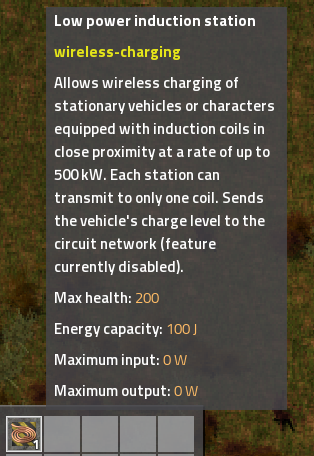 Charge your equipped batteries using the newest in near-field wireless energy transfer technology. Simply equip an induction coil in your armor or vehicle and be in close proximity to an induction ground station to have it transfer energy directly form your power grid into your batteries. Designed to be used together with Electric Vehicles. Gives batteries a purpose!