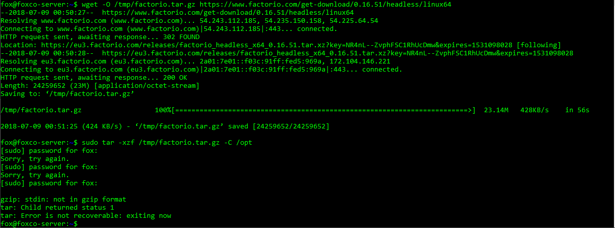 i hate to necro this post but, im having problems, im at the part where you install factorio on the server, i used the direct command "wget -O /tmp/factorio.tar.gz https://www.factorio.com/get-download/0 ... ess/linux6". but when i run the next command "sudo tar -xzf /tmp/factorio.tar.gz -C /opt" it does not seem to work. here is a screen shot of my terminal