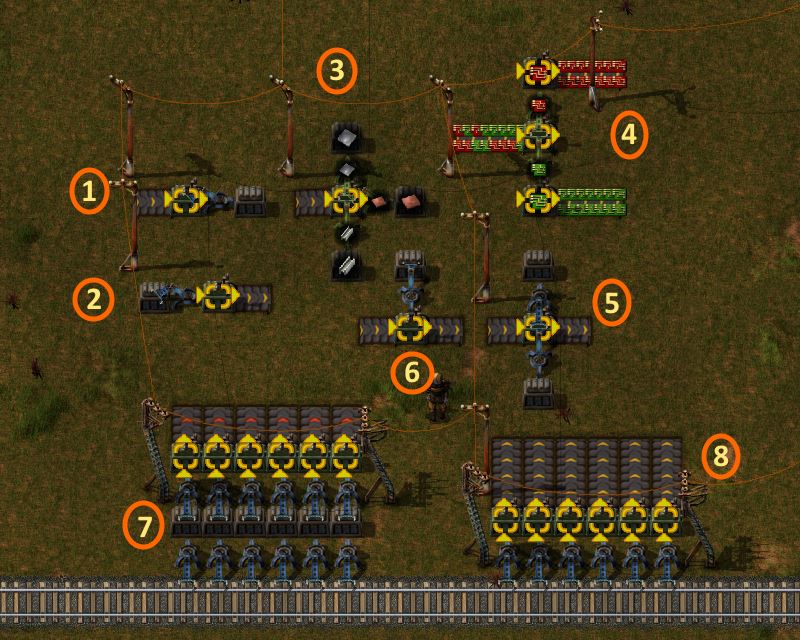 - (8) A simple train station using just belt chests. If the belt chests fill up from the train faster than the belt empties them, then the station won't be as efficient as it could be.