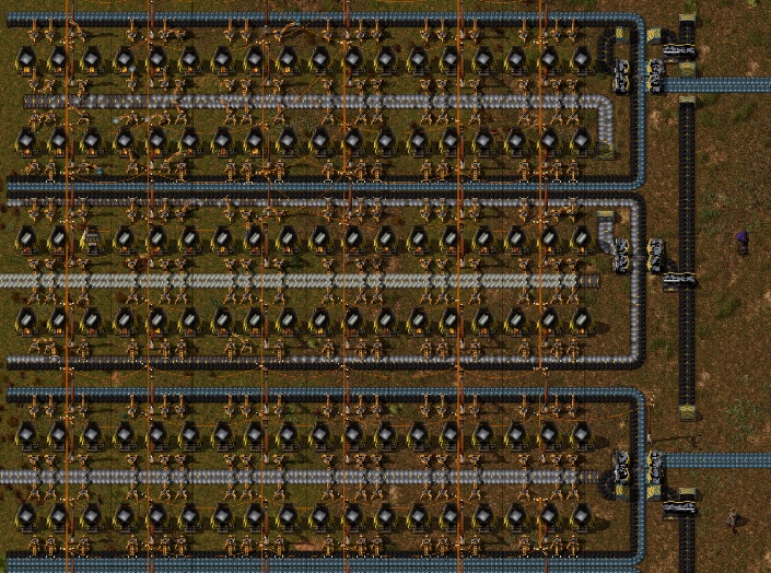I lay the same furnace setup (bottom) for all iron and copper except iron output belts destined for steel - these go in the opposite direction to other iron outputs, while the splitters are tucked into the corners a bit making room to switch the iron over to steel reasonably tidily.
