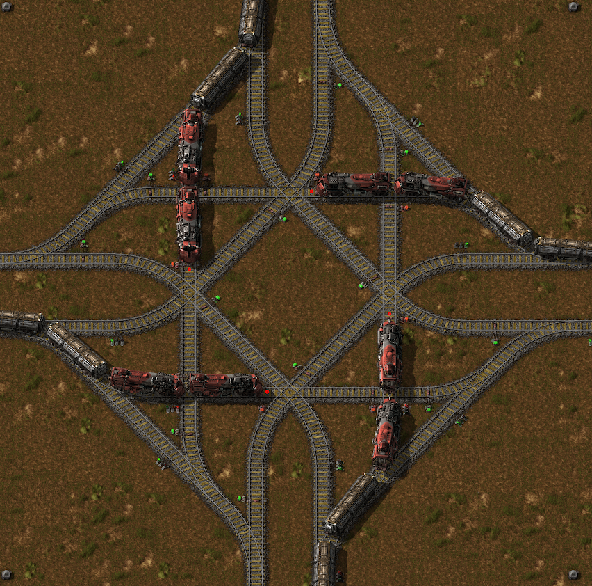 For what it does, allows trains entering from any direction to exit in any direction, a safe roundabout is neat, pretty, simple and uses the least amount of track vs other solutions. Easy to understand and can be built from memory without blueprints. Prior to 0.15 you had to either download the blueprint string mod (30K dls) or make your first rail crossing manually and then blueprint it. Ease of use for the approximately 800K players who don't have the mod.saturn7 wrote:It's interesting how much worse the roundabout is compared to a simple compact intersection. Despite that, I have seen in many threads players promoting roundabouts as the best and only way to do 4-way intersections. Is there some benefit of a roundabout (apart from being able to reverse) that is not apparent here?