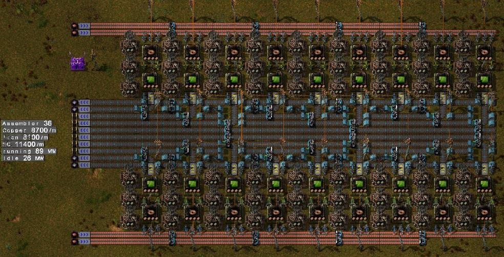 I confess to being a little bemused. Around 12 months ago, when I was fresh-faced and still quite new to Factorio, I did a LOT of research on the forums and Reddit to gain some thoughts and insights into designs for various parts of my bus and rail setup. This solution for green circuits was posted (I think I actually tweaked another design, similar to one of the ones already mentioned in this thread), but it doesn't seem to have caught on. It should be made with Assembler 3s (not 2s) for max throughput, IIRC, but it certainly seems to me to be a pretty decent "maxed" design - input 2 express belts of copper, split an express or feed two fast belts of iron, and presto! Out pops 1 express belt of Electronic Circuits. Did I miss something, however? Is there an issue with this design?