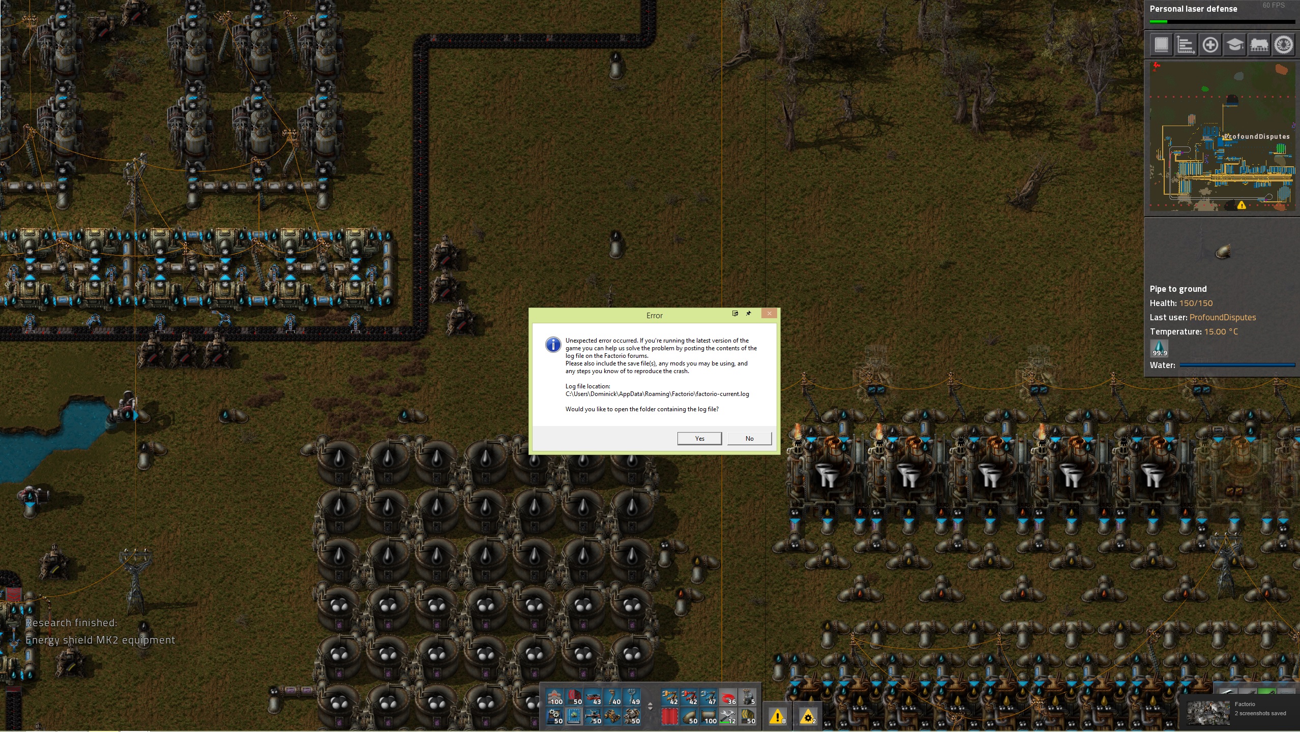 I went to steam and changed to latest release. It downloaded and loaded up fine. I went into mods section and checked for updates. Without updating or disabling any mods I loaded attached save file and was greeted by the errors as seen in the photos than it crashed to desktop. I tried re-loading the Factorio and updating a single mod that was available and then disabled all mods that are not for version .16. I received the exact same error. I than tried disabling all mods, I received the same errors. I than tried my other 5 files and all of them do exactly the same thing. I than tried rolling back to latest .15 build. I kept all mods off and reloaded my attached save. Even in .15 its giving me the same error. I currently can't play factorio in any version, without it crashing to desktop.