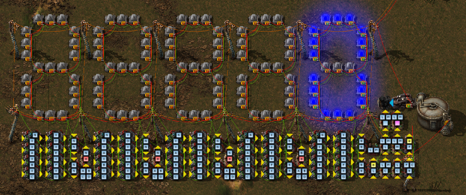 Reactor core This one is relatively simple. It has two reactors, belts, inserters to insert full and remove empty fuel cells and heat pipes to dissipate the heat. It seems that having double width heat pipe helps the heat dissipate faster. When multiple reactors are chained, part of the heat wire will overlap. The inserter has stack size set to 1 and is attached to a red wire so it can respond to a signal to grab a fuel cell (signal G, condition >0). The combinator is hooked to the belt piece and checks whether there are at least 3 fuel cells available, indicating that the inserter would be able to grab one, and sends a ready signal to the controller (signal R, value 1). The constant combinator is used to count the number of reactors (signal N, value 1) in the layout.