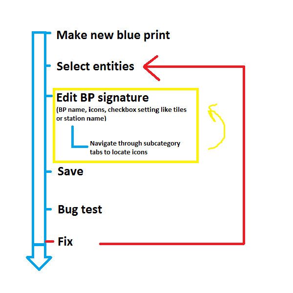 Actual Blueprinting workflow for anyone who builds complex designs (e.g. involving circuits or rails) The yellow section, the part where you have to go through all 4 item category tabs (worst case), type an ideally unique and distinct string, remember to hit all the necessary check boxes and so forth actually forms the bulk of the work when creating a blue print. It can easily take 20s worth of concentrated clicking and thinking while everything else is mostly confirming stuff in a sec. A single mistake (especially with the checkboxes) and you might have to start all over again even though the actual blueprint is correct.
