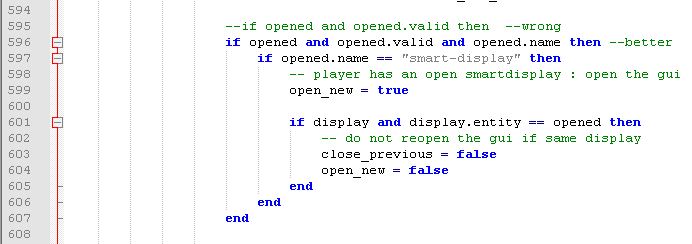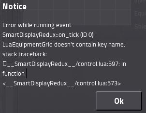 In Factorio 16, I'm running into a conflict between the Smart Display mod and Power Armor. With a Smart Display entity placed on the map, as soon as I right-click Power Armor, it crashes to an error message (attached) and ends the game. Had a similar problem with Belt Sorter, but the modder posted a code change to a Control.lua file that corrected it. I looked in the Smart Display control folder but didn't see any code comparable to what I had seen in the Belt Sorter code...thought the same fix might work here but didn't see where to try it. Could be a completely different conflict issue.