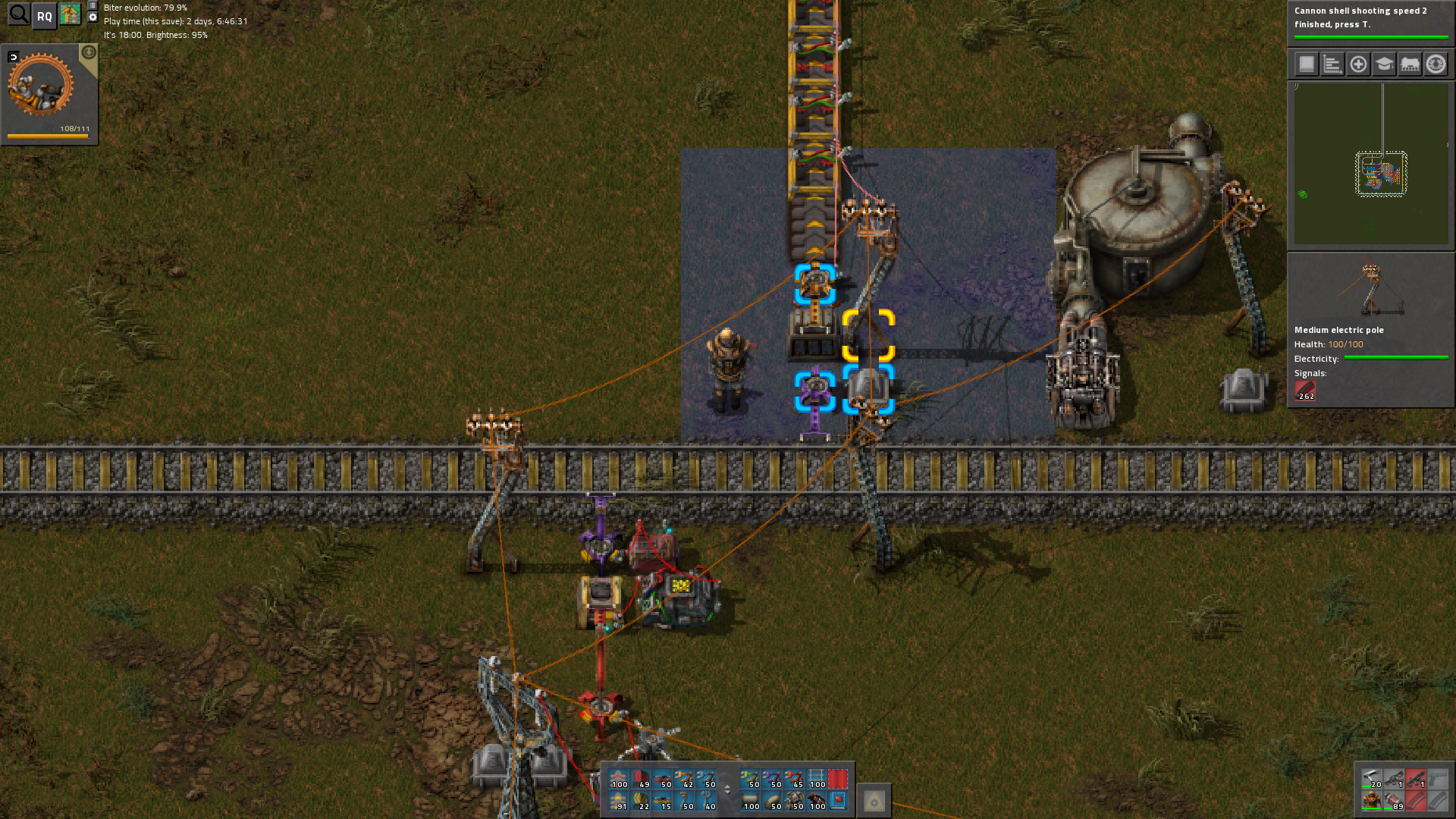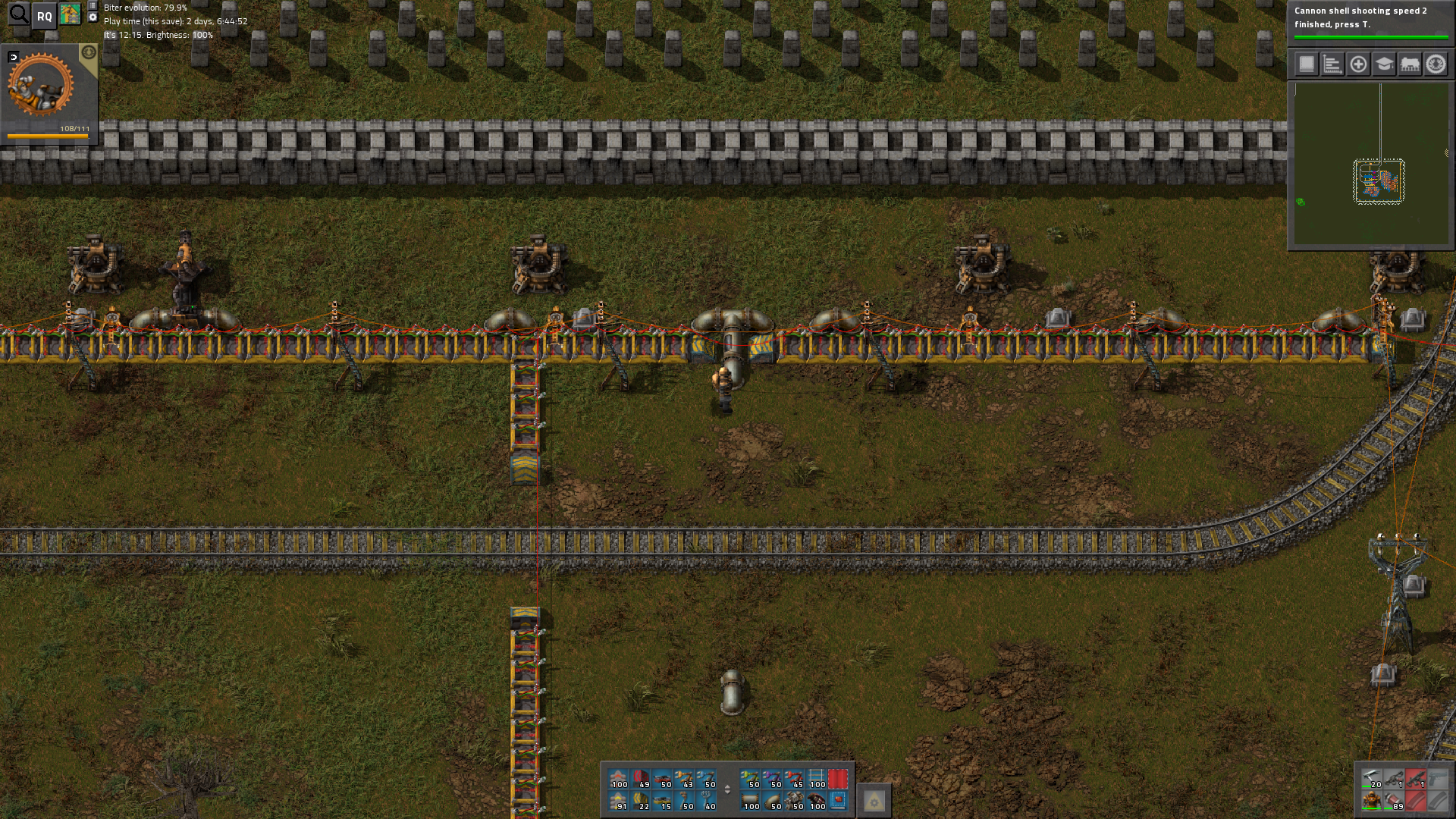 I don't tend to play enough with biters to know. It may be clever, but not applicable.mrvn wrote:But do you really only want 100 ammo on the belt no matter the size? Isn't 1 ammo per 10 tiles better? A larger base has more turrets and gets attacked more. So you want more ammo on the belt so that some ammo is near every turret and reload times remain constant at every size.Zanthra wrote:That's clever, especially if you are expanding the gunwall to cover more area, you don't have to go back and change the combinator options.The Eriksonn wrote:Or you could have a dummy item on the belt, iron plate maybe, and using that to see if there has passed 100 ammo for every lap of the iron