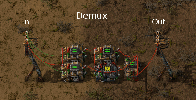The demultiplexer, at least for me, is the one that took a lot of thought. It takes the multiplexed signal on the red wire, and the channel to extract as signal Q on the green wire. The demuxer updates its output every time the inputs Q and D are equal (plus I think two ticks), so cycling Q through various values is probably not all that useful. The two left deciders produce everything (top) and D (bottom), if this is the correct clock cycle. On other clock cycles they produce nothing. The middle combinators take the "everything" and filter out signal D. The final combinator remembers what it was given the last time D was non-zero. (In the blueprint, I've replaced top-center decider with an each+0=>each arithmetic. It works the same and makes it easier to free up signal Q.)
