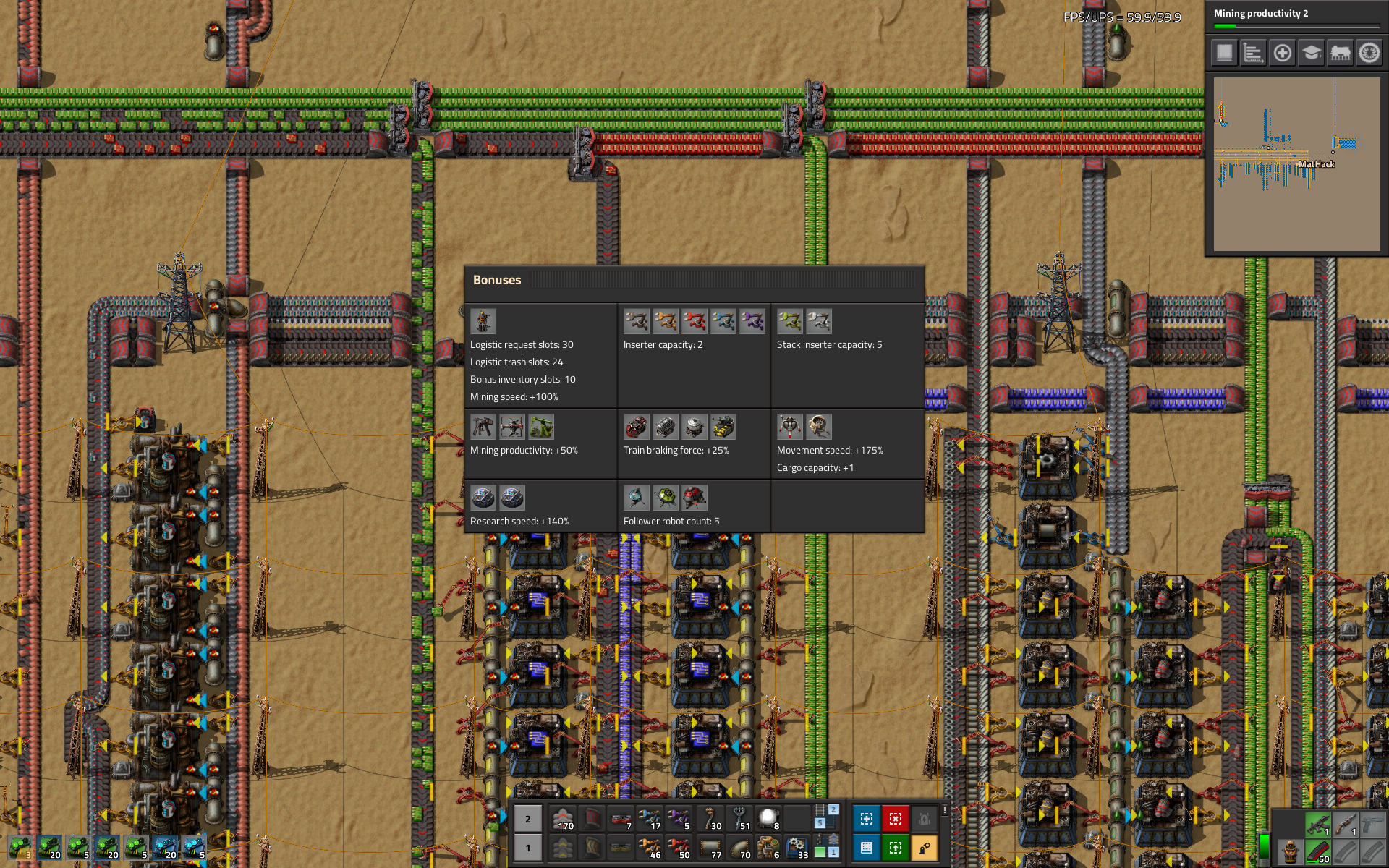 That's also my understanding of it. Got one research done that displays +10% in research, but got +50% in bonuses.MatHack wrote: Mon Mar 04, 2019 6:47 pmNo, that's not expected, it says +10% for Mining productivity 1 in-game, not +50%.tehfreek wrote: Mon Mar 04, 2019 6:43 pmSure, but that's expected and documented. The issue is whether 50% for the first step is too generous.Feedbackfor017 wrote: Mon Mar 04, 2019 6:38 pm I have only "Mining productivity 1" now but +50% productivity so i can confirm this behaviour.
