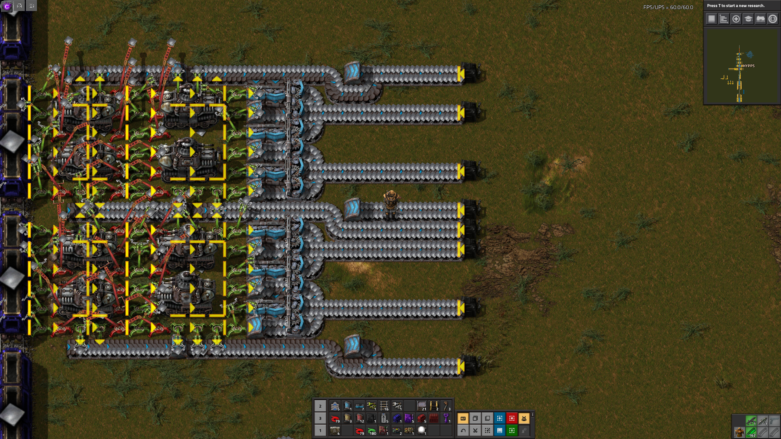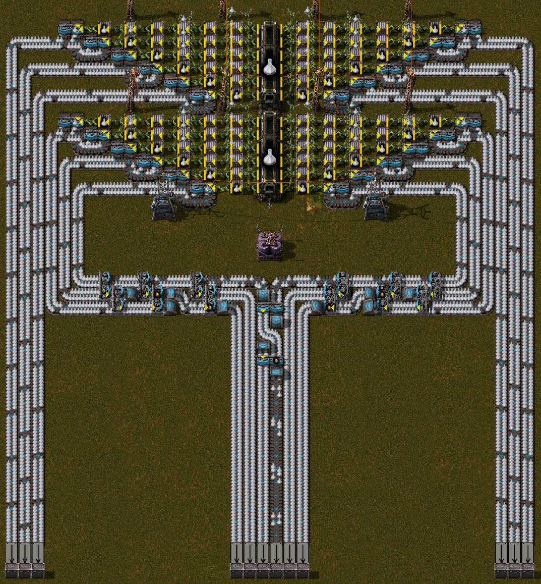 This might be possible. But is it sustainable?F_W wrote: Sat Sep 14, 2019 6:58 pm Here's my contribution that sustains ~5.19 blue belts (14,010 items/min) of throughput and is tileable