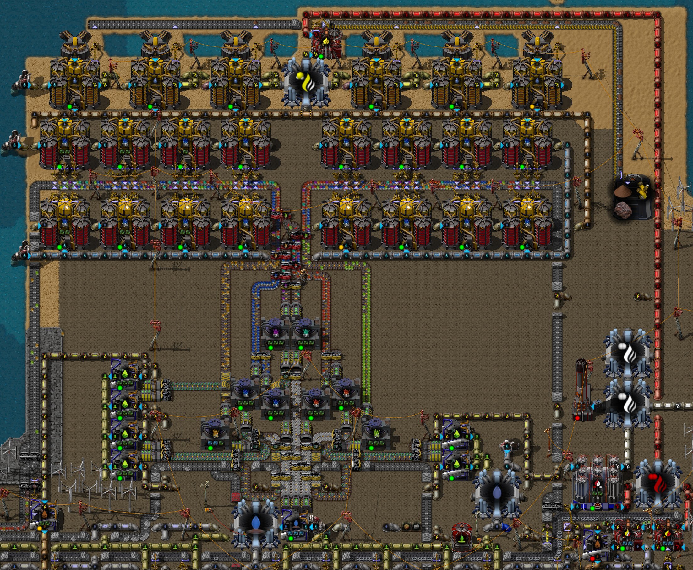 I've place 20 boilers for exported power but only ~16.8 can be sustained for an average of 30.2 MW. The build uses Deadlocks loaders. Replacing them with inserters is left to the reader. You will loose some power output with inserters though. The ratios are also a bit off. 2 Electrolyzer can only supply 2.66 assembler to make cellulose paste instead of 4. Or 19.91 assemblers for cellulose fibers from wood while I have 24. But it keeps things orderly.
