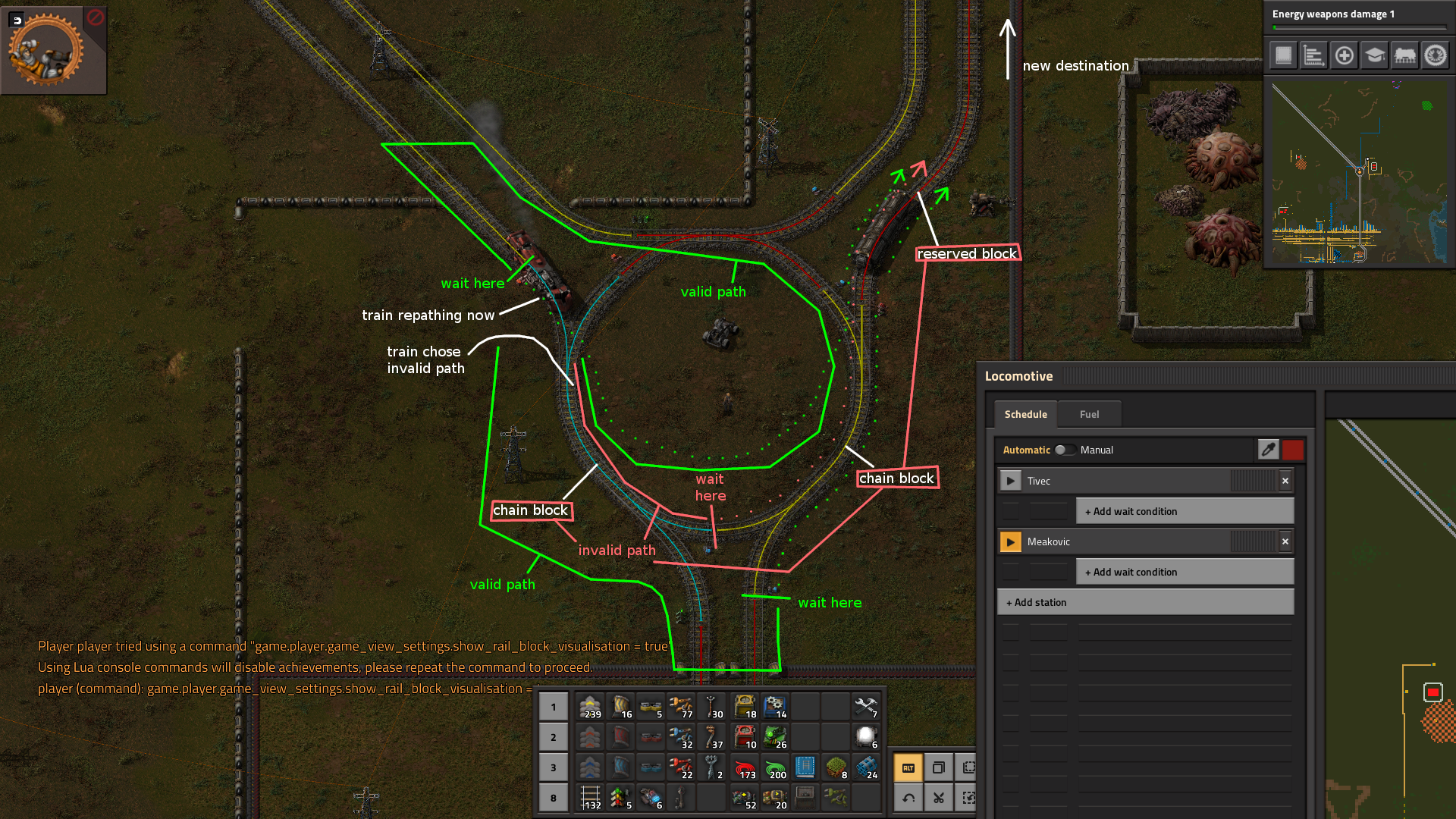 I threw together a test rig with a roundabout and 3 exits, and told my test locomotive to go to one station (south), then switched to another (north-east) as soon as it entered the roundabout. I expected it to head down the southbound exit, because I thought that the new rule would prevent it from picking the southern leg of the roundabout for its path (since that path consists of only chain signals followed by a reserved block), but it did pick the southern leg, and planted itself in the roundabout. The southern station loops and comes back north, so the expected behavior would have been to exit south (following the old reserved path), loop through the southern station, and wait at the southern entry to the roundabout.FactorioBot wrote: Fri May 10, 2019 2:36 pm Changes[...]