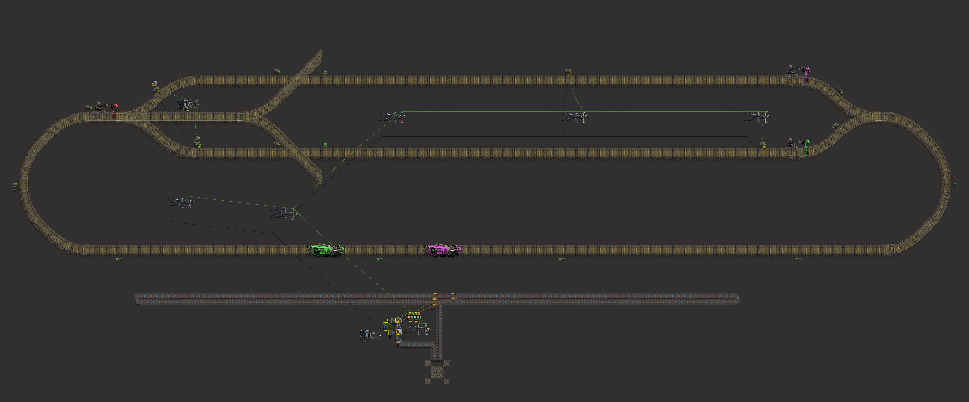 However, regarding the question of why I might want to have a way to force multiple trains into the same block, I think something similar to DaveMcW's Magnet Signals mod would be pretty cool to include in the base game (forcing signals green via the circuit network perhaps), as then you could do things like this: