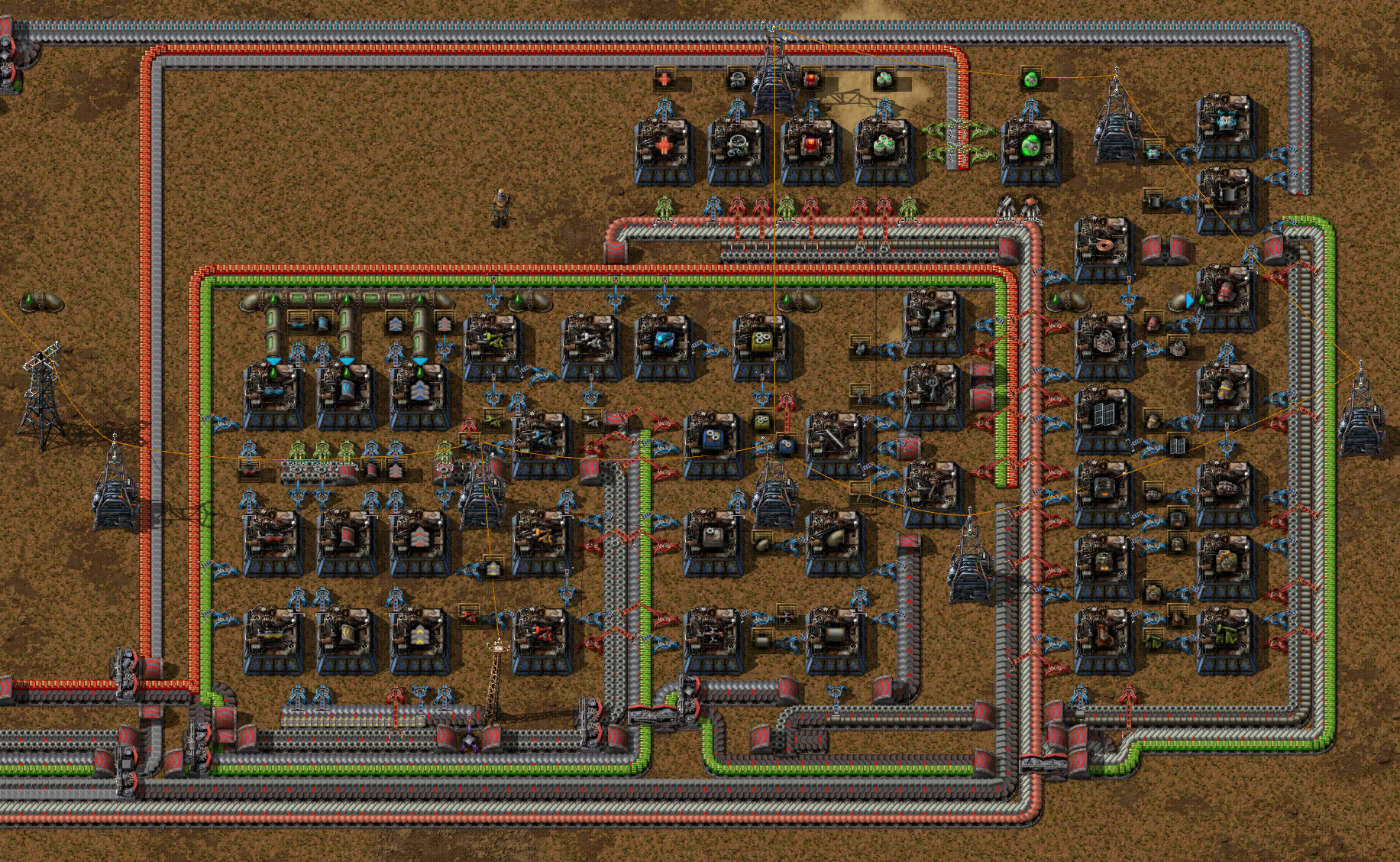 This mall can be gradually built up from early game, starting with the lower left, skipping as-of-yet unneeded splitters, and filling it out as needed. I decided to snapshot this with level 2 assemblers and red belts, as that's fairly representative of the level at which you can really expand it. Obviously, earlier versions will be peppered full of power poles, while I show this after using substations for a more appetizing presentation. No blue underground length belts are needed, nor is any belt threading or annoying to hand-build design used.